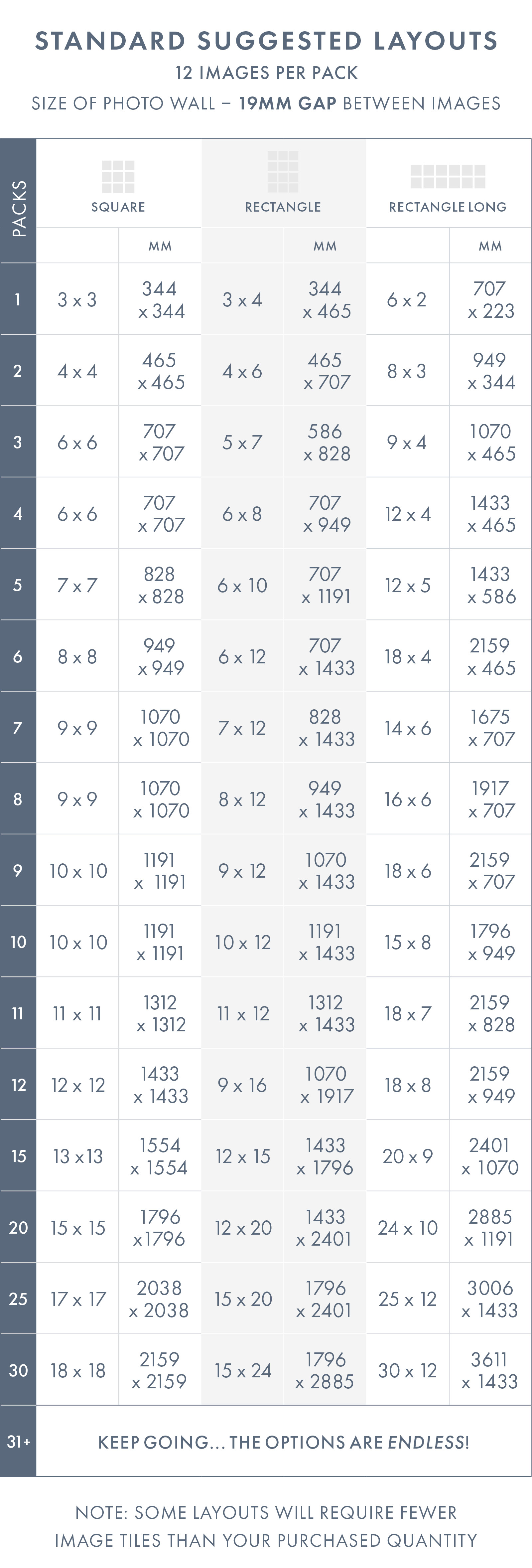 STEP 1. Choose a layout of rows & columns and the corresponding dimensions using the Photo Wall Standard Size Guide (shown below).